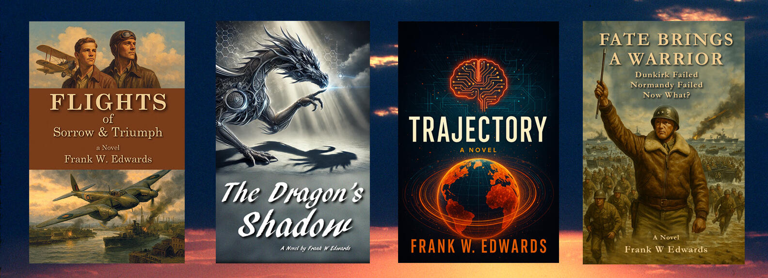 Frank W. Edwards combines a lifelong passion for military history with a talent for storytelling. He holds a BA in journalism and attended Old Dominion University, Norfolk State University, and Radford University.Over a 41-year career in the Nuclear Propulsion Division at Newport News Shipbuilding, Frank honed his technical writing skills in naval design and engineering. Now retired in Glendale, Arizona, he dedicates his time to crafting meticulously researched, gripping narratives.With a storyteller’s flair and a historian’s attention to detail, other books include: The Dragon’s Shadow, a present-day thriller of international espionage; Trajectory, a high-stakes techno-thriller where an AI developer’s creation unleashes hidden truths that could spark revolution; Fate Brings a Warrior, reimagines a failed D-Day, and what the Allies would do next.